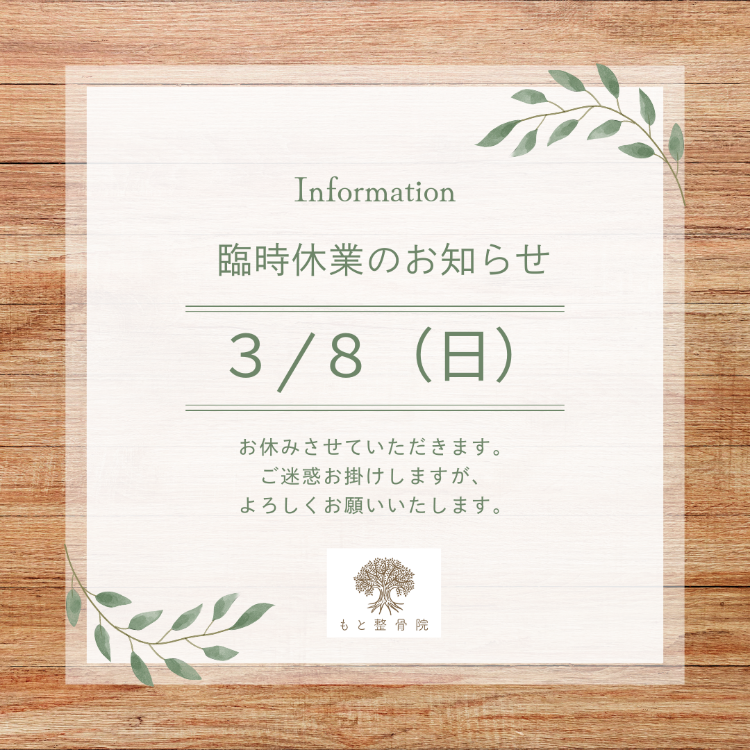 3連休の初日である 3/20(金・祝)10:00〜15:00 の臨時受付を、ぜひ身体のケアに活用してください。