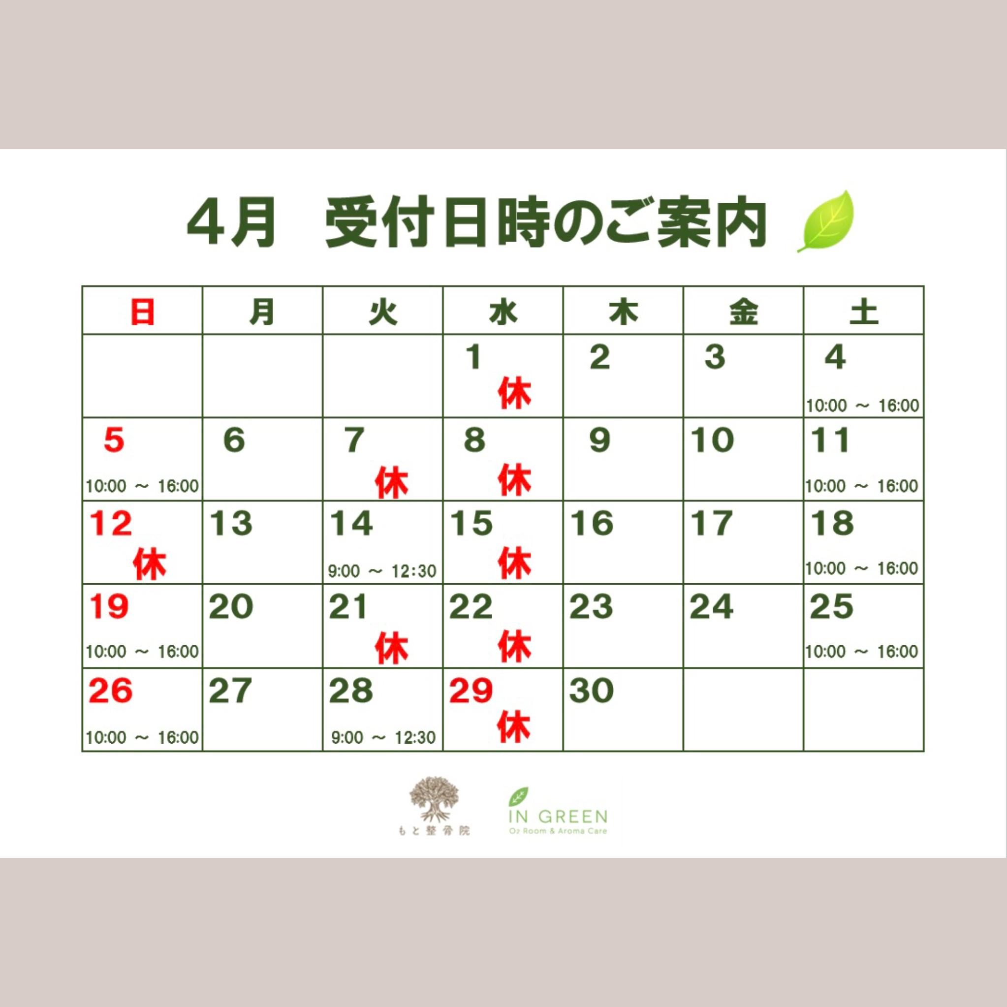 【神戸三宮|もと整骨院】4月の受付案内|捻挫・肉離れ・ぎっくり腰・寝違えは保険施術/腰痛・肩こり・しびれは整体で改善